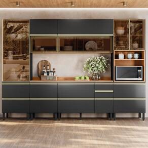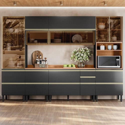 Em um lar, a cozinha é mais do que um espaço para cozinhar — é o coração das memórias, onde aromas e risadas se entrelaçam. Nossa nova linha de cozinhas moduladas de alto padrão, produzida em MDF com acabamento Textura Prime TX, foi pensada para transformar esse espaço em um cenário de sofisticação e praticidade. Acabamento da Prateleira: Pintura Escala de Brilho da Prateleira: Fosco Acabamento da Gaveta: Pintura Texturizada UV Escala de Brilho da Gaveta: Fosco Material do Puxador da Gaveta: Metal Acabamento da Porta: Pintura Texturizada UV Escala de Brilho da Porta: Fosco Material do Puxador da Porta: Metal Acabamento dos Pés: Pintura Acompanha Rodapé Decorativo: Não Acompanha Tampo: Sim Altura dos Pés: 17 cm Altura Máxima dos Pés: 17.0000 Ambiente Principal: Cozinha Balcão Suporta Pia: Sim codigo_ean: 7900288186379 Complexidade da Montagem: Alta: deve ser montado por um montador especializado Cor: Nogueira/Carbono Prime Cor do Produto: Nogueira/Carbono Prime Cor Flex: Não Cor Interna: Nogueira Escala de Brilho: Fosco Espessura do Material da Estrutura: 15 mm Espessura do Tampo: 20 mm Gaveta com Chave: Não Informações Complementares: As cores do produto podem sofrer variações de tonalidade de acordo com as configurações do seu dispositivo. Imagens meramente ilustrativas. Itens para decorar o produto e o ambiente não acompanham o produto. Caixa revestida por plástico termoencohível e p Itens Inclusos: 1 Cozinha Completa, Acessórios e Manual de Montagem Linha ou Coleção: Proença Manual de Especificação Técnica: https://product-hub-prd.madeiramadeira.com.br/740731752/documents/4be3d187-2ccd-425e-86ae-8f1025475bc73042155302817514626136811.pdf Manual de Montagem e Instalação: https://product-hub-prd.madeiramadeira.com.br/740731752/documents/1a50ff1a-313b-4df9-b203-69ea0a702e383042153302817514625988061.pdf Marca: Demóbile Material da Corrediça: Alumínio Material da Dobradiça/Corrediça da Porta: Metálica Material da Gaveta: MDF Material da Porta: MDF Material da Prateleira: MDF Material do Fundo: HDF Material do Tampo: MDF Material dos Pés: Polipropileno Medida de cada item (A x L x P): Cristaleira (218,5 x 60 x 52) / Balcão (93 x 60,1 x 52) / Armário Aéreo (72 x 60 x 52) / Balcão Pia (84 x 119,4 x 52) / Tampo Balcão Pia (9 x 119,5 x 52) / Armário Aéreo (72 x 120 x 52) / Paneleiro (218,5 x 70 x 52) modular: Sim Montagem Flex: Não Necessita Montagem: Sim O Balcão Acompanha Pia: Não Origem do Produto: Nacional Pés Reguláveis: Sim Peso: 254,78 kg Peso Máximo por Gaveta: 10 kg Peso Máximo por Prateleira: 10 kg Possui Pés: 17 Possui Portas: Sim Possui Prateleiras: Sim Possui recorte para Cooktop: Não Possui Rodízio: Não Possui Vidro: Sim Produto Montado: Sim Recomendações de Uso, Manutenção e Limpeza: Higienizar com flanela limpa e seca. Sapatas Niveladoras: Não Sistema de Montagem: Parafusos e cavilhas. Suporta Até (kg): 242 kg Tamanho Indicado da Pia: 120CM Tipo de Corrediça da Gaveta: Metálica Telescópica Tipo de Dobradiça da Porta: Soft close Tipo de Dobradiça/Corrediça da Porta: Soft Close Tipo de Puxador da Gaveta: Externo Tipo de Puxador da Porta: Externo