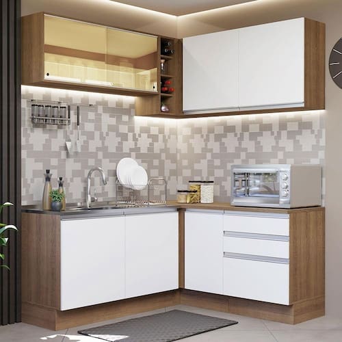 Por se tratar de uma cozinha modulada, você pode organizar as peças conforme a necessidade do seu espaço. Assim, se torna praticamente uma cozinha planejada.