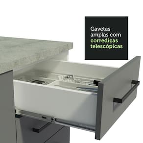 É um móvel de qualidade superior, sendo composta por puxadores com alça em alumínio, gavetas com corrediças telescópicas de abertura total e portas com amortecimento para fechamento suave.