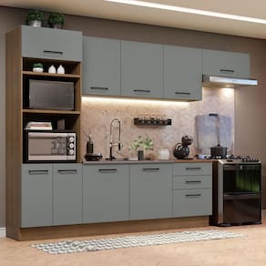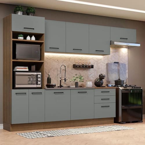 Por se tratar de uma cozinha modulada, você pode organizar as peças conforme a necessidade do seu espaço. Assim, se torna praticamente uma cozinha planejada.