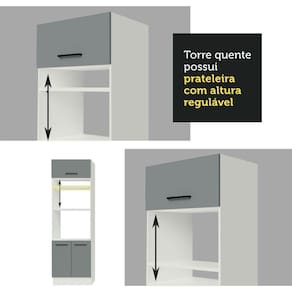 O acabamento da estrutura é branco e o das portas e frentes é cinza. É feito em Pintura Poliéster com 7 camadas que protegem o móvel dos efeitos do álcool da água e do calor.
