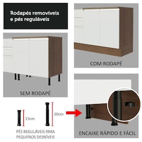 Para completar, a cozinha conta com pés reguláveis em PVC e rodapé removível em MDP de fácil encaixe, para retirar na hora de realizar a limpeza.