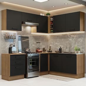 O acabamento da estrutura é em amadeirado Rustic e o das portas e frentes é preto. É feito em Pintura Poliéster com 7 camadas que protegem o móvel dos efeitos do álcool da água e do calor.