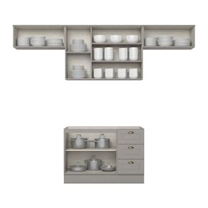 A Cozinha Completa 4 Peças 100% MDF Internacional apresenta corrediças telescópicas, é fabricada 100% em MDF e possui dobradiças metálicas de 35 mm com amortecimento. Seus puxadores em metal Zamac na cor ouro velho adicionam um toque de elegância vintage. É uma escolha que une praticidade, durabilidade e estilo contemporâneo. Acabamento da Prateleira: Pintura Texturizada UV Escala de Brilho da Prateleira: Fosco Acabamento da Gaveta: Pintura Texturizada UV Escala de Brilho da Gaveta: Fosco Material do Puxador da Gaveta: Metal Acabamento da Porta: Pintura Texturizada UV Escala de Brilho da Porta: Fosco Material do Puxador da Porta: Metal Acompanha Tampo: Não Ambiente Principal: Cozinha Complexidade da Montagem: Média: pode ser montado por mais de uma pessoa e/ou necessite de maior conhecimento para montagem Cor: Cinza Cor do Produto: Cinza Cor Flex: Cinza Cor Interna: Trama Branco Escala de Brilho: Fosco Espessura do Material da Estrutura: 15 mm Gaveta com Chave: Não Itens Inclusos: 1 Cozinha e Manual de Montagem Linha ou Coleção: Internacional Manual de Montagem e Instalação: https://cdn2.madeiramadeira.com.br/atributo/henn-infantil-e-bebe-cozinha/2028037-4325-17176773619973.pdf Material da Dobradiça/Corrediça da Porta: Metálica Material da Gaveta: MDF Material da Porta: MDF Material da Prateleira: MDF Material do Fundo: MDF Medida de cada item (A x L x P): Aéreo 03 Portas: 83cm X 120cm X 32,5cm Balcão 03: 82cm X 120cm X 51cm Aéreo 01 Porta: 34cm X 80cm X 32,5cm Aéreo 01 Porta: 34cm X 80cm X 32,5cm modular: Não Necessita Montagem: Sim O Balcão Acompanha Pia: Não Origem do Produto: Nacional Peso: 93 kg Peso Máximo por Gaveta: 3 kg Peso Máximo por Prateleira: 8 kg Possui Pés: Não Possui Portas: Sim Possui Prateleiras: Sim Possui recorte para Cooktop: Não Possui Vidro: Não Recomendações de Uso, Manutenção e Limpeza: Recomendações de Uso, Manutenções e Limpeza: Para limpeza de seu móvel, use uma flanela limpa e seca. Não utilize produtos químicos que possam danificar o produto. Sistema de Montagem: Parafusos e Cavilhas Suporta Até (kg): 60 kg Tamanho Indicado da Pia: (L x P) 120 x 53,5cm Tamanho Indicado do Tampo: (L x P) 120 x 53,5cm Tamanho Indicado do Tampo ou Pia: (L x P) 120 x 53,5cm Tipo de Corrediça da Gaveta: Metálica Telescópica Tipo de Dobradiça da Porta: 35 mm Tipo de Puxador da Gaveta: Externo Tipo de Puxador da Porta: Externo