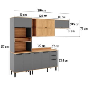 Um Cozinha tão bonita quanto funcional – essa é a Cozinha Castanha, que tem tudo para deixar a sua rotina mais prática e o seu lar ainda mais estiloso. Combinando o moderno tom Cinza com o amadeirado Freijó, traz aqui uma configuração de 4 módulos que possuem delicados efeitos de moldura e ferragens de alta qualidade. Tem tudo para ser perfeita para você preparar refeições e desfrutar de momentos especiais com a família e amigos. Acabamento da Prateleira: Finish Foil Escala de Brilho da Prateleira: Semi-Brilho Acabamento da Gaveta: Finish Foil Escala de Brilho da Gaveta: Semi-Brilho Material do Puxador da Gaveta: Alumínio Acabamento da Porta: Finish Foil Escala de Brilho da Porta: Semi-Brilho Material do Puxador da Porta: Alumínio Acabamento dos Pés: Polipropileno Acompanha Rodapé Decorativo: Não Acompanha Tampo: Sim Altura dos Pés: 17 cm Altura Máxima dos Pés: 17.0000 Ambiente Principal: Cozinha Balcão Suporta Pia: Sim codigo_ean: 7900288173843 Complexidade da Montagem: Média: pode ser montado por mais de uma pessoa e/ou necessite de maior conhecimento para montagem Cor: Cinza / Freijó Cor do Produto: Cinza / Freijó Cor Flex: Não Cor Interna: Cinza / Freijó Escala de Brilho: Semi-Brilho Espessura do Material da Estrutura: 15 mm Espessura do Tampo: 24 mm Gaveta com Chave: Não Itens Inclusos: 1 Cozinha Completa, Ferragens e Manual de Montagem Linha ou Coleção: Castanha Manual de Montagem e Instalação: https://product-hub-prd.madeiramadeira.com.br/644734114/documents/9c17be7d-94b5-4994-8fc3-a06740ae9620293515812931747411068532.pdf Marca: Telasul Material da Corrediça: Metálica Material da Dobradiça/Corrediça da Porta: Alumínio Material da Gaveta: MDP Material da Porta: MDP Material da Prateleira: MDP Material do Fundo: MDF Material do Tampo: MDP Material dos Pés: Polipropileno Medida de cada item (A x L x P): Paneleiro: 217 cm x 70 cm x 52 cm; Armário: 73 cm x 120 cm x 31 cm; Armário: 38,5 cm x 80 cm x 31 cm; Balcão: 93,5 cm x 120 cm x 52 cm modular: Sim Montagem Flex: Sim, todos os módulos são separados, e podem ser montados conforme desejado. Necessita Montagem: Sim O Balcão Acompanha Pia: Não Origem do Produto: Nacional Pés Reguláveis: Sim Peso: 131,66 kg Peso Máximo por Gaveta: 3 kg Peso Máximo por Prateleira: 18 kg Possui Pés: 10 Possui Portas: Sim Possui Prateleiras: Sim Possui recorte para Cooktop: Não Possui Rodízio: Não Possui Vidro: Não Produto Montado: Sim Recomendações de Uso, Manutenção e Limpeza: Na limpeza, utilizar pano macio levemente umedecido em água e sabão neutro. Após, secar para evitar mofo no produto. Nunca utilizar álcool ou produtos abrasivos e, principalmente, esponjas de aço ou qualquer material que arranhe a superfície. Evitar o armazenamento de substância ácidas (sal, vinagre, limão, cebola, etc) em contato direto com o móvel. Sapatas Niveladoras: Sim Sistema de Montagem: Parafusos e cavilhas Suporta Até (kg): 267 kg Tamanho Indicado da Pia: 1,20 m Tipo de Corrediça da Gaveta: Metálica Telescópica Tipo de Dobradiça da Porta: Soft close Tipo de Puxador da Gaveta: Externo Tipo de Puxador da Porta: Externo