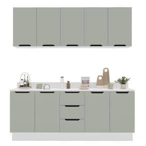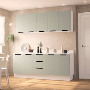 A cozinha 4 peças Meena da Politorno Móveis é a solução ideal para quem busca organização e estilo. Com 224,5cm de altura, 200cm de largura e 52cm de profundidade, ela conta com 1 balcão com 3 gavetas e 4 portas, além de 5 armários aéreos, oferecendo amplo espaço para armazenar utensílios e mantimentos. Seu design elegante, aliado a materiais de alta qualidade, proporciona um ambiente moderno e funcional. As corrediças telescópicas garantem um deslizamento suave das gavetas, enquanto o acabamento em pintura UV assegura resistência e durabilidade. O produto já vem com tampo, proporcionando uma solução completa para sua cozinha. Possui rodapé. Acabamento da Prateleira: Finish Foil Escala de Brilho da Prateleira: Semi-Fosco Acabamento da Gaveta: Finish Foil Escala de Brilho da Gaveta: Semi-Fosco Material do Puxador da Gaveta: Plástico Acabamento da Porta: Finish Foil Escala de Brilho da Porta: Semi-Fosco Material do Puxador da Porta: Plástico Acompanha Tampo: Sim Ambiente Principal: Cozinha Balcão Suporta Pia: Não codigo_ean: 7900288152015 Complexidade da Montagem: Média: pode ser montado por mais de uma pessoa e/ou necessite de maior conhecimento para montagem Cor: Branco/Verde Oliva Cor do Produto: Branco/Verde Oliva Cor Interna: Branco Escala de Brilho: Semi-Fosco Gaveta com Chave: Não Itens Inclusos: 1 Cozinha, Manual de Montagem e Kit Ferragens Linha ou Coleção: Meena Manual de Montagem e Instalação: https://product-hub-prd.madeiramadeira.com.br/977978/documents/608a6c55-3f58-4967-b10a-3fab610389342892228622417460374416133.pdf Marca: Politorno Material da Dobradiça/Corrediça da Porta: Alumínio Material da Gaveta: MDP Material da Porta: MDP Material da Prateleira: MDP Material do Tampo: MDP Material dos Pés: MDF Medida de cada item (A x L x P): Balcão 92,5cm x 120cm x 52 cm; Aéreo 66 cm x 120 cm x 30,5 cm; Balcão 92,5cm x 80cm x 52cm; Aéreo 66cm x 80cm x 30,5cm modular: Não Necessita Montagem: Sim O Balcão Acompanha Pia: Não Origem do Produto: Nacional Pés Reguláveis: Não Peso: 92,35 kg Peso Máximo por Gaveta: 5 kg Peso Máximo por Prateleira: 3 kg Possui Pés: Rodapé Possui Portas: Sim Possui Prateleiras: Sim Possui recorte para Cooktop: Não Possui Rodízio: Não Produto Montado: Sim Recomendações de Uso, Manutenção e Limpeza: Utilize um pano macio umedecido com água e sabão neutro, seguido de pano seco. Não utilize produtos químicos ou abrasivos para limpeza, pois estes danificam o revestimento do móvel. Sapatas Niveladoras: Sim Sistema de Montagem: Cavilha, Parafuso, Minifix e prego Suporta Até (kg): 30 kg Tipo de Corrediça da Gaveta: Metálica Telescópica Tipo de Dobradiça da Porta: Soft close Tipo de Puxador da Gaveta: Externo Tipo de Puxador da Porta: Externo