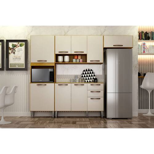Cozinha Completa 4 Peças 9 Portas - Maísa-Cinamomo/Off White - CHF Móveis Você nunca imaginou que sua cozinha pudesse ficar tão bonita e organizada.A Cozinha Maísa é fabricada em MDP de 12mm, possui 9 portas com dobradiças metálicas, puxadores ABS bronze, 2 gavetas com corrediças telescópicas, pés reguláveis, e paneleiro com espaço para micro-ondas. Fazem parte do anúncio: 1 Cozinha Completa 4 Peças 9 Portas - Maísa - CHF Móveis Obs: Objetos de decoração não fazem parte deste anúncio. Particularidades do Armário: Características: - Estrutura em MDP/MDF 15mm; - Puxadores em ABS; - Dobradiças metálicas; - Corrediças telescópicas; - Pés com altura ajustave; - Espaço para micro-ondas; - Portas basculantes com pistão a gás; - Acabamento com pintura UV brilhante; - Peso máximo suportado: Prateleira 20kg; Dimensões do Armário: Altura: 2,02 metros Largura: 2,53 metros Profundidade: 39 centímetros Informações Importantes: - Produtos podem apresentar diferenças de tonalidades entre a foto na tela e o produto real, devido a calibração de cor de tela. - Limpar com flanela ou pano macio. Não utilizar álcool. Não utilizar produtos abrasivos ou corrosivos. - Nós prezamos pela qualidade da entrega em primeiro lugar, trabalhamos com transportadoras altamente selecionadas e os melhores materiais de embalagem. - A montagem é de total responsabilidade do comprador. Antes de comprar, verifique o espaço disponível para a montagem. - Certifique-se de que o produto caiba em elevadores e vãos de escadas, não fazemos içamentos ou desmontagens de produtos. Quaisquer despesas deste tipo ficam a cargo do cliente. - Garantia de 3 meses contra defeitos de fabricação.