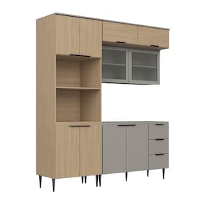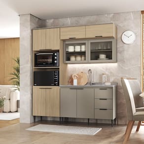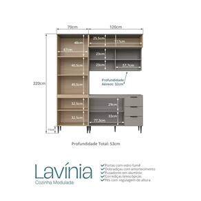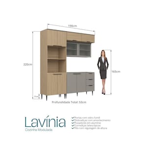 A cozinha Lavínia completa com 4 peças é uma excelente opção para quem busca praticidade, estilo moderno e funcionalidade no dia a dia. Possui um moderno Aéreo com vidro fumê. Torre quente com espaço para micro-ondas e forno com as suas medidas A:40,5 XL 67 X P: 53 para o micro e forno A: 40,5 X L: 67 X P: 53 cm, possui dobradiças com amortecimento, puxadores em alumínio, corrediças telescópicas e pistão a gás. Suas medidas totais 220 cm de altura 190 cm de comprimento e 53 cm de profundidade.