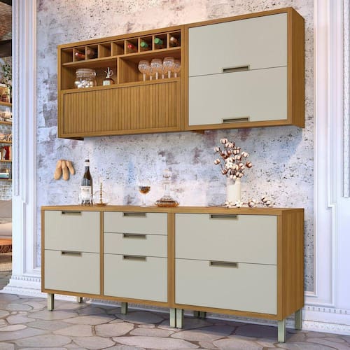 A Cozinha Completa 4 Peças Imperatriz Nesher 100% MDF tem design contemporâneo, robusto e é muito pratica. Inspirada em cozinhas planejadas, está disponível em módulos, permitindo composições variadas, projetos exclusivos, conforme o espaço e o gosto do consumidor. O armário aéreo de 120cm, foi projeto com uma porta articulada ripada, que traz aconchego, grande beleza e harmonia ao conjunto. Disponível em duas cores de porta, off-white e grafite, como o corpo sempre amadeirado freijó. Projetada para proporcionar praticidade e funcionalidade no uso diário, produzida com matérias prima de alto nível e ferragens tecnológicas de última geração. Todo o projeto foi pensado para embelezar sua cozinha com muita praticidade no uso e muita qualidade e durabilidade no dia a dia. Acabamento da Prateleira: Impressão Escala de Brilho da Prateleira: Semi-Brilho Acabamento da Gaveta: Impressão Escala de Brilho da Gaveta: Semi-Brilho Material do Puxador da Gaveta: Alumínio Acabamento da Porta: Impressão Escala de Brilho da Porta: Semi-Brilho Material do Puxador da Porta: Alumínio Acabamento dos Pés: Pintura Acompanha Tampo: Sim Altura dos Pés: 16 cm Altura Máxima dos Pés: 16.0000 Ambiente Principal: Cozinha codigo_ean: 7908506240698 Complexidade da Montagem: Média: pode ser montado por mais de uma pessoa e/ou necessite de maior conhecimento para montagem Cor: Freijó/Off White Cor do Produto: Freijó/Off White Cor Flex: Não Cor Interna: Freijó Escala de Brilho: Semi-Brilho Gaveta com Chave: Não Informações Complementares: Modernas portas com abertura basculante e pistão a gás. - Puxadores em perfil de Alumínio na cor bronze, moderno, com qualidade e durabilidade. - Corrediça Telescópica Abertura Integral: Robusta e com três estágios, esta corrediça é ideal para o uso diári Itens Inclusos: 2 Armários Aéreos, 2 Balcão e Manual de Montagem. Linha ou Coleção: Imperatriz - Nesher Manual de Montagem e Instalação: https://product-hub-prd.madeiramadeira.com.br/653473/documents/a1dd2d7b-a0eb-4064-b155-a81189a341ee8bb403c44822595cozinha4pcs.pdf Material da Dobradiça/Corrediça da Porta: Metálica Material da Gaveta: MDF Material da Porta: MDF Material da Prateleira: MDF Material do Fundo: Chapa de Fibra Material do Tampo: MDF Material dos Pés: Polipropileno Medida de cada item (A x L x P): Aéreo: 78cm x 80cm x 32cm; Aéreo Adega: 78cm x 120cm x 32cm; Balcão 1 Gaveta 1 Porta: 86cm x 80cm x 52cm; Balcão 2 Portas, 4 Gavetas: 86cm x 120cm x 52cm Medida do Recorte para Cooktop: 62cm x 35cm Montagem Flex: Não Necessita Montagem: Sim O Balcão Acompanha Pia: Não Origem do Produto: Nacional Pés Reguláveis: Sim Peso: 145,4 kg Peso Máximo por Gaveta: 5 kg Peso Máximo por Prateleira: 15 kg Possui Pés: 09 Possui Portas: Sim Possui Prateleiras: Sim Possui recorte para Cooktop: Não Possui Rodízio: Não Produto Montado: Sim Recomendações de Uso, Manutenção e Limpeza: Utilizar pano macio levemente umedecido e na sequencia pano macio seco. Sapatas Niveladoras: Sim Sistema de Montagem: Parafusos, Cavilhas e Minifix Suporta Até (kg): 110 kg Tamanho Indicado da Pia: 120 x 53cm Tipo de Corrediça da Gaveta: Metálica Telescópica Tipo de Dobradiça da Porta: Metálica Tipo de Dobradiça/Corrediça da Porta: Metálica Tipo de Puxador da Gaveta: Externo Tipo de Puxador da Porta: Externo