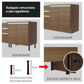 Para completar, a cozinha conta com pés reguláveis em PVC e rodapé removível em MDP de fácil encaixe, para retirar na hora de realizar a limpeza.