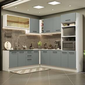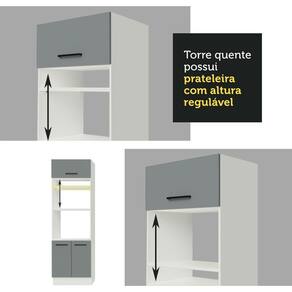 O acabamento da estrutura é branco e o das portas e frentes é cinza. É feito em Pintura Poliéster com 7 camadas que protegem o móvel dos efeitos do álcool da água e do calor.