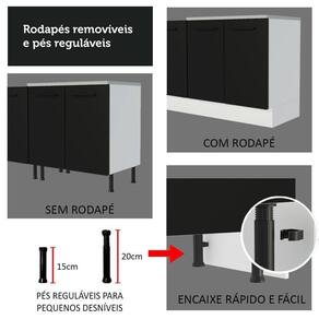 Para completar, a cozinha conta com pés reguláveis em PVC e rodapé removível em MDP de fácil encaixe, para retirar na hora de realizar a limpeza.