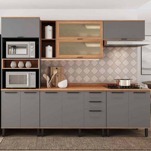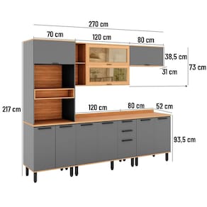 A Cozinha Castanha é a escolha certa para quem procura um móvel com beleza e qualidade comprovada! Com a aparência encantadora dos móveis planejados e a facilidade de já estar pronta para qualquer espaço, essa cozinha é desenvolvida com componentes de ótima qualidade. Perfeita para transformar suas refeições em momentos especiais e inesquecíveis no conforto do seu lar. Acabamento da Prateleira: Finish Foil Escala de Brilho da Prateleira: Semi-Brilho Acabamento da Gaveta: Finish Foil Escala de Brilho da Gaveta: Semi-Brilho Material do Puxador da Gaveta: Alumínio Acabamento da Porta: Finish Foil Escala de Brilho da Porta: Semi-Brilho Material do Puxador da Porta: Alumínio Acabamento dos Pés: Polipropileno Acompanha Rodapé Decorativo: Não Acompanha Tampo: Sim Altura dos Pés: 17 cm Altura Máxima dos Pés: 17.0000 Ambiente Principal: Cozinha Balcão Suporta Pia: Sim codigo_ean: 7900288169877 Complexidade da Montagem: Média: pode ser montado por mais de uma pessoa e/ou necessite de maior conhecimento para montagem Cor: Cinza / Freijó Cor do Produto: Cinza / Freijó Cor Flex: Não Cor Interna: Cinza / Freijó Escala de Brilho: Semi-Brilho Espessura do Material da Estrutura: 15 mm Espessura do Tampo: 24 mm Gaveta com Chave: Não Itens Inclusos: 1 Cozinha e Manual de Montagem Linha ou Coleção: Castanha Manual de Montagem e Instalação: https://product-hub-prd.madeiramadeira.com.br/686006125/documents/253e5ca3-5e9c-42e3-a0f9-2bd395b29c2e29355021293174741601625.pdf Marca: Telasul Material da Corrediça: Metálica Material da Dobradiça/Corrediça da Porta: Metálica Material da Gaveta: MDP Material da Porta: MDP Material da Prateleira: MDP Material do Fundo: MDF Material do Tampo: MDP Material dos Pés: Polipropileno Medida de cada item (A x L x P): Paneleiro: 217 cm x 70 cm x 52 cm; Armário: 73 cm x 120 cm x 31 cm; Armário: 38,5 cm x 80 cm x 31 cm; Balcão: 93,5 cm x 120 cm x 52 cm; Balcão: 93,5 cm x 80 cm x 52 cm modular: Sim Montagem Flex: Sim, todos os módulos são separados e podem ser montados conforme desejado. Necessita Montagem: Sim O Balcão Acompanha Pia: Não Origem do Produto: Nacional Pés Reguláveis: Sim Peso: 157,66 kg Peso Máximo por Gaveta: 3 kg Peso Máximo por Prateleira: 15 kg Possui Pés: 14 Possui Portas: Sim Possui Prateleiras: Sim Possui recorte para Cooktop: Não Possui Rodízio: Não Possui Vidro: Sim Produto Montado: Sim Recomendações de Uso, Manutenção e Limpeza: Na limpeza, utilizar pano macio levemente umedecido em água e sabão neutro. Após, secar para evitar mofo no produto. Nunca utilizar álcool ou produtos abrasivos e, principalmente, esponjas de aço ou qualquer material que arranhe a superfície. Evitar o armazenamento de substância ácidas (sal, vinagre, limão, cebola, etc) em contato direto com o móvel. Sapatas Niveladoras: Sim Sistema de Montagem: Parafusos e cavilhas Suporta Até (kg): 338 kg Tamanho Indicado da Pia: 1,20 m Tipo de Corrediça da Gaveta: Metálica Telescópica Tipo de Dobradiça da Porta: Soft close Tipo de Puxador da Gaveta: Externo Tipo de Puxador da Porta: Externo