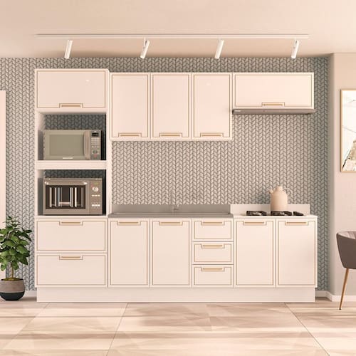 Modular : Não Peso (kg) : 150.34 Garantia : 06 Meses Altura (cm) : 224.5 Acabamento : Pintura UV Largura (cm) : 270 Possui Pés : Rodapé Possui Vidro : Não Possui Portas : Sim Tipo de Porta : Misto (Bater e Basculante) Altura dos Pés : 15 Pés Reguláveis : Sim Possui Gavetas : Sim Possui Rodízio : Não Suporta Até (kg) : 30 Acompanha Tampo : Não Profundidade (cm) : 52 Escala de Brilho : Semi-Fosco Gaveta com Chave : Não Material dos Pés : Plástico Serviço Montagem : 114259443 Material da Porta : MDF/MDP Origem do Produto : Nacional Acabamento dos Pés : Pintura Ambiente Principal : Cozinha Balcão Suporta Pia : Sim Material da Gaveta : MDF/MDP Material Principal : MDF/MDP Possui Prateleiras : Sim Acabamento da Porta : Finish Foil Quantidade de Peças : 5 Sapatas Niveladoras : Sim Acabamento da Gaveta : Finish Foil Balcão Acompanha Pia : Não Material da Prateleira : MDF/MDP Peso Máximo por Gaveta : 5 Acabamento da Prateleira : Finish Foil Tipo de Puxador da Porta : Externo Escala de Brilho da Porta : Semi-Fosco Tipo de Puxador da Gaveta : Externo Escala de Brilho da Gaveta : Semi-Fosco Peso Máximo por Prateleira : 3 Tipo de Armário de Cozinha : Cozinha Completa Possui Recorte para Cooktop : Não Tipo de Corrediça da Gaveta : Metálica Telescópica Material do Puxador da Porta : Alumínio Material do Puxador da Gaveta : Alumínio Escala de Brilho da Prateleira : Semi-Fosco Medida de Cada Item (A x L x P) (novo) : Balcão: 81x120x50,5; Aéreo 66x120x30,5; Basculante 36x80x30,5; Torre Quente 224,5x70x52; Balcão 92,5x80x52 Material da Dobradiça/Corrediça da Porta : Alumínio Marca : Politorno Cor Interna : Branco Cor : Branco Cor do Produto : Branco Itens Inclusos : 1 Cozinha, Kit Ferragens e Manual de Montagem Cor Predominante : Branco Linha ou Coleção : Amara Quantidade de Prateleiras : 04 Prateleiras Quantidade de Portas : 10 Portas Quantidade de Gavetas : 04 Gavetas Tamanho Indicado do Tampo (L x P) : 120x52