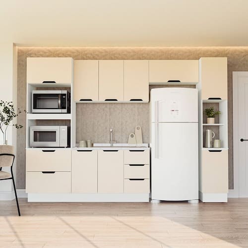Itens Inclusos: 1 Balcão, 1 Aéreo, 1 Basculante,1 Torre Quente, 1 Paneleiro, Kit Ferragens e Manual de Montagem