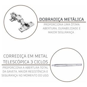 Os módulos são avulsos (cada peça é independente uma da outra) possibilitando assim vários arranjos, o espaço interno, que vem com prateleiras e divisórias, é ótimo para organização dos utensílios e mantimentos. Fabricados em material resistente, como chapas de MDP 15mm, corrediças telescópicas e dobradiças metálicas. Com puxadores cromados em ABS, pés em plástico com regulagem de altura.