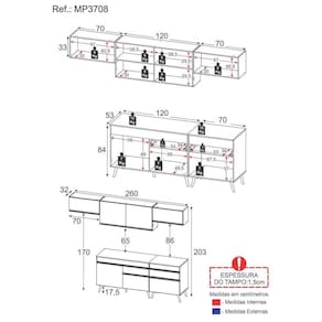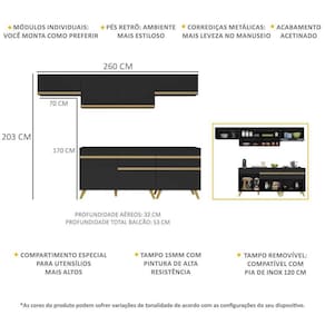Dimensões do produto montado: Altura: 203cm | Largura: 260cm | Profundidade: 32cm (aéreos) - 53cm (balcão com tampo) *Você pode consultar as medidas internas na imagem técnica do produto.
