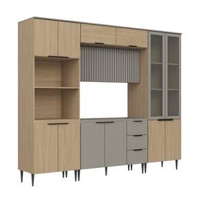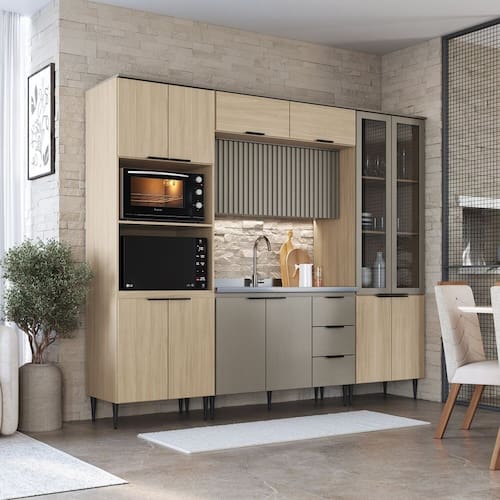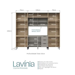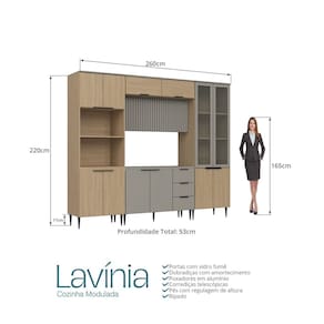A cozinha Lavínia completa com 5 peças é uma excelente escolha para quem busca sofisticação, funcionalidade e um toque moderno no ambiente. Possui uma moderna cristaleira com vidro fumê e um lindo aéreo ripado deixando o seu espaço cheio de charme. Torre quente com espaço para micro-ondas e forno com as suas medidas A:40,5 XL 67 X P: 53 para o micro e forno A: 40,5 X L: 67 X P: 53 cm, possui dobradiças com amortecimento, puxadores em alumínio, corrediças telescópicas e pistão a gás. Suas medidas totais 220 cm de altura 260 cm de comprimento e 53 cm de profundidade. Acabamento da Prateleira: Finish Foil Escala de Brilho da Prateleira: Fosco Acabamento da Gaveta: Finish Foil Escala de Brilho da Gaveta: Fosco Material do Puxador da Gaveta: Alumínio Acabamento da Porta: Finish Foil Escala de Brilho da Porta: Fosco Material do Puxador da Porta: Alumínio Acompanha Tampo: Não Altura dos Pés: 17 cm Altura Máxima dos Pés: 17.0000 Ambiente Principal: Cozinha Balcão Suporta Pia: Sim codigo_ean: 7900288246226 Complexidade da Montagem: Média: pode ser montado por mais de uma pessoa e/ou necessite de maior conhecimento para montagem Cor: Imperial/Fumê Cor do Produto: Imperial/Fumê Cor Flex: Não Cor Interna: Imperial/Fumê Escala de Brilho: Fosco Espessura do Material da Estrutura: 15 mm Gaveta com Chave: Não Informações Complementares: 14 Portas Itens Inclusos: 1 Cozinha Completa, Kit Ferragem e Manual QR Code Linha ou Coleção: Lavínia Manual de Especificação Técnica: https://product-hub-prd.madeiramadeira.com.br/594581220/documents/dea7b063-9923-4c0e-9d38-ca1f041e2f1b3214455266217582055453635.pdf Manual de Montagem e Instalação: https://product-hub-prd.madeiramadeira.com.br/594581220/documents/e4356ed9-1164-4f3f-bb77-5eba05bd547f3214454266217582055320838.pdf Marca: j carvalho Material da Corrediça: Metálica Material da Dobradiça/Corrediça da Porta: Metálica Material da Gaveta: MDP Material da Porta: MDP/Vidro Material da Prateleira: MDP Material dos Pés: Polipropileno Medida de cada item (A x L x P): Torre quente A 220 x C 70 x P 53 - Balcão de Pia A 85 x C 120 x P 53 - Aéreo Ripado A 52 x C 120 x P 32 - Aéreo Basc. A 28,5 x C 120 x P 53 - Cristaleira A 220 x C 70 x P 53 modular: Sim Necessita Montagem: Sim O Balcão Acompanha Pia: Não Origem do Produto: Nacional Pés Reguláveis: Sim Peso: 197,7 kg Peso Máximo por Gaveta: 5 kg Peso Máximo por Prateleira: 5 kg Possui Pés: 13 Possui Portas: Sim Possui Prateleiras: Sim Possui recorte para Cooktop: Não Possui Rodízio: Não Produto Montado: Sim Recomendações de Uso, Manutenção e Limpeza: Flanela umedecida Sapatas Niveladoras: Não Sistema de Montagem: Parafusos Tamanho Indicado da Pia: 120X53 Tamanho Indicado do Tampo: 120X53 Tipo de Corrediça da Gaveta: Metálica Telescópica Tipo de Dobradiça da Porta: Simples Tipo de Dobradiça/Corrediça da Porta: Simples Tipo de Puxador da Gaveta: Externo Tipo de Puxador da Porta: Externo