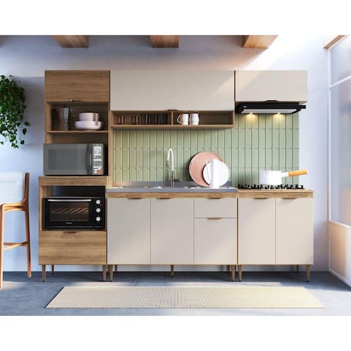 Cozinha modulada Veneza possui surpreendente espaço interno, design e cores sofisticadas que combinam perfeitamente com qualquer decoração. A gaveta possui corrediça metálica resistente, as portas basculantes contam com dobradiças e pistão à gás para o fechamento suave. Possui prateleiras internas. Com puxadores ergonômicos e pés modernos Esses itens de qualidade superior conferem durabilidade e maior vida útil ao móvel. Composta de chapa MDP 15mm. Os módulos são avulsos (cada peça é independente uma da outra) e podem ser arranjados de diferentes formas, o que permite que, nesse caso, você monte uma cozinha do seu jeito. A principal premissa das cozinhas completas moduladas Delmarco é atender a todas as necessidades que podem aparecer pelo cômodo com o máximo de praticidade e economia. Acabamento da Prateleira: Finish Foil Escala de Brilho da Prateleira: Fosco Acabamento da Gaveta: Finish Foil Escala de Brilho da Gaveta: Fosco Material do Puxador da Gaveta: Plástico Acabamento da Porta: Finish Foil Escala de Brilho da Porta: Fosco Material do Puxador da Porta: Plástico 832547: 848735 =B2=A2: =B106=A106 Acabamento dos Pés: Polipropileno Acompanha Tampo: Não Altura dos Pés: 17 cm Altura Máxima dos Pés: 17.0000 Ambiente Principal: Cozinha codigo_ean: 7909903300817 Complexidade da Montagem: Média: pode ser montado por mais de uma pessoa e/ou necessite de maior conhecimento para montagem Cor: Mel/Arenas Cor do Produto: Mel/Arenas Cor Flex: Não Cor Interna: Mel Escala de Brilho: Fosco Gaveta com Chave: Não Informações Complementares: Total Itens Inclusos: 1 Cozinha compacta com manual de montagem e kit ferragens Linha ou Coleção: Veneza Manual de Montagem e Instalação: https://product-hub-prd.madeiramadeira.com.br/848735/documents/c8b97c55-9750-4692-bfa0-065d46a3cf061316962ve0010manual.pdf Material da Dobradiça/Corrediça da Porta: Aço Material da Gaveta: MDP Material da Porta: MDP Material da Prateleira: MDP Material do Fundo: MDP Material dos Pés: Polipropileno Medida de cada item (A x L x P): Torre - 200x63x52 / Aéreo - 54x120x32 / Balcão pia - 84x120x52 / Aéreo - 30,6x70x32 / Balcão - 85,5x70x52 Montagem Flex: Não Necessita Montagem: Sim O Balcão Acompanha Pia: Não Origem do Produto: Nacional Pés Reguláveis: Sim Peso: 119,5 kg Peso Máximo por Gaveta: 5 kg Peso Máximo por Prateleira: 5 kg Possui Pés: 13 Possui recorte para Cooktop: Não Possui Rodízio: Não Produto Montado: Sim Recomendações de Uso, Manutenção e Limpeza: Para limpeza do móvel, use uma flanela seca Sapatas Niveladoras: Não Sistema de Montagem: Parafusos, cavilhas e minifix Suporta Até (kg): 25 kg Tamanho Indicado da Pia: 1.2 Tamanho Indicado do Tampo: 1.2 Tipo de Corrediça da Gaveta: Simples Tipo de Dobradiça da Porta: Simples Tipo de Puxador da Gaveta: Externo Tipo de Puxador da Porta: Externo