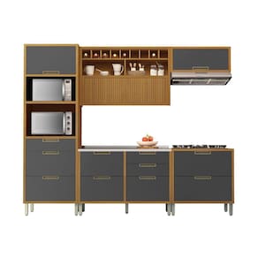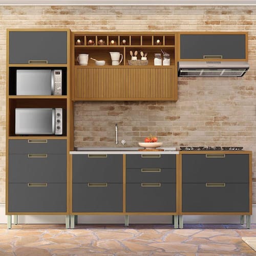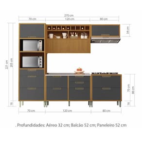 A Cozinha Completa 5 Peças Imperatriz Nesher 100% MDF tem design contemporâneo, robusto e é muito pratica. Inspirada em cozinhas planejadas, está disponível em módulos, permitindo composições variadas, projetos exclusivos, conforme o espaço e o gosto do consumidor. O armário aéreo de 120cm, foi projeto com uma porta articulada ripada, que traz aconchego, grande beleza e harmonia ao conjunto. Disponível em duas cores de porta, off-white e grafite, como o corpo sempre amadeirado freijó. Projetada para proporcionar praticidade e funcionalidade no uso diário, produzida com matérias prima de alto nível e ferragens tecnológicas de última geração. Todo o projeto foi pensado para embelezar sua cozinha com muita praticidade no uso e muita qualidade e durabilidade no dia a dia. Acabamento da Prateleira: Impressão Escala de Brilho da Prateleira: Semi-Brilho Acabamento da Gaveta: Impressão Escala de Brilho da Gaveta: Semi-Brilho Material do Puxador da Gaveta: Alumínio Acabamento da Porta: Impressão Escala de Brilho da Porta: Semi-Brilho Material do Puxador da Porta: Alumínio Acabamento dos Pés: Pintura Acompanha Tampo: Sim Altura dos Pés: 16 cm Altura Máxima dos Pés: 16.0000 Ambiente Principal: Cozinha codigo_ean: 7908506240759 Complexidade da Montagem: Média: pode ser montado por mais de uma pessoa e/ou necessite de maior conhecimento para montagem Cor: Freijó/Grafite Cor do Produto: Freijó/Grafite Cor Flex: Não Cor Interna: Freijó Escala de Brilho: Semi-Brilho Gaveta com Chave: Não Informações Complementares: Modernas portas com abertura basculante e pistão a gás. - Puxadores em perfil de Alumínio na cor bronze, moderno, com qualidade e durabilidade. - Corrediça Telescópica Abertura Integral: Robusta e com três estágios, esta corrediça é ideal para o uso diári Itens Inclusos: 1 Paneleiro, 2 Armários Aéreos, 2 Balcões e Manual de Montagem. Linha ou Coleção: Imperatriz - Nesher Manual de Montagem e Instalação: https://product-hub-prd.madeiramadeira.com.br/653483/documents/17494a9f-cdf6-4927-8f5e-2d1066ad5968073125cozinha5pcsgeladeira.zip Material da Dobradiça/Corrediça da Porta: Metálica Material da Gaveta: MDF Material da Porta: MDF Material da Prateleira: MDF Material do Fundo: Chapa de Fibra Material do Tampo: MDF Material dos Pés: Polipropileno Medida de cada item (A x L x P): Aéreo Geladeira: 34cm x 80cm x 32cm; Aéreo Adega: 78cm x 120cm x 32cm; Paneleiro: 221cm x 70cmx52cm; Balcão 1 Gaveta 1 Porta: 86cm x 80cm x 52cm; Balcão 2 Portas, 4 Gavetas: 86cm x 120cm x 52cm Medida do Recorte para Cooktop: 62cm x 35cm Montagem Flex: Não Necessita Montagem: Sim O Balcão Acompanha Pia: Não Origem do Produto: Nacional Pés Reguláveis: Sim Peso: 201,9 kg Peso Máximo por Gaveta: 5 kg Peso Máximo por Prateleira: 15 kg Possui Pés: 13 Possui Portas: Sim Possui Prateleiras: Sim Possui recorte para Cooktop: Não Possui Rodízio: Não Produto Montado: Sim Recomendações de Uso, Manutenção e Limpeza: Utilizar pano macio levemente umedecido e na sequencia pano macio seco. Sapatas Niveladoras: Sim Sistema de Montagem: Parafusos, Cavilhas e Minifix Suporta Até (kg): 130 kg Tamanho Indicado da Pia: 120 x 53cm Tipo de Corrediça da Gaveta: Metálica Telescópica Tipo de Dobradiça da Porta: Metálica Tipo de Dobradiça/Corrediça da Porta: Metálica Tipo de Puxador da Gaveta: Externo Tipo de Puxador da Porta: Externo