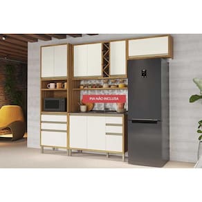 Cozinha Completa Tempranillo 5 Peças (2Aéreos+1Balcão+1TorreQuente+1Complemento) C5P79 Amendoa/Off White - Ronipa Abaixo segue os produtos que compoem o KIT: - Prateleira de Cozinha Tempranillo 120cm Amendoa - Ronipa - 1 unidades Dimensões: Alt: 10cm x Larg120cm x Comp/Profund:120cm