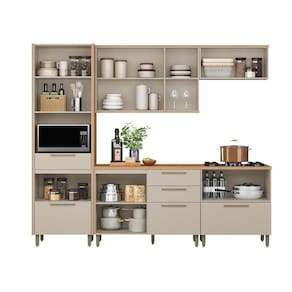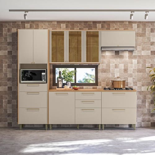 A Cozinha Atena é composta por 5 módulos que combinam perfeitamente design moderno e elegância. Produzida em 100% MDF, oferece alta durabilidade e um acabamento de qualidade superior. O projeto conta com dobradiças com sistema de amortecimento, além de um aéreo de 1,20m com porta de vidro reflecta e detalhe canelado, que conferem um toque sofisticado ao ambiente. O conjunto inclui ainda uma torre funcional, ideal para quem precisa de mais espaço para armazenamento. Já os módulos inferiores contam com gavetas amplas, garantindo praticidade e organização no dia a dia. Uma escolha perfeita para quem busca uma cozinha funcional, charmosa e cheia de estilo.