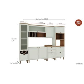 Produto 100% MDF, possui portas e gavetas no estilo provençal, puxadores nos balcões em formato de concha e nos aéreos são pontuais.