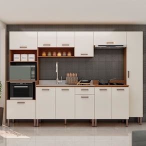 Facilidade de Montagem: Com um sistema modular, a montagem é simples e rápida. Acabamento da Prateleira: Pintura Escala de Brilho da Prateleira: Brilhante Acabamento da Gaveta: Pintura Escala de Brilho da Gaveta: Brilhante Material do Puxador da Gaveta: MDF Acabamento da Porta: Pintura Escala de Brilho da Porta: Brilhante Material do Puxador da Porta: PVC Acabamento dos Pés: Pintura Acompanha Rodapé Decorativo: Não Acompanha Tampo: Não Altura dos Pés: 17 cm Altura Máxima dos Pés: 17.0000 Ambiente Principal: Cozinha Balcão Suporta Pia: Sim codigo_ean: 7900288167774 Complexidade da Montagem: Média: pode ser montado por mais de uma pessoa e/ou necessite de maior conhecimento para montagem Cor: Freijo/White laca Cor do Produto: Freijo/White laca Cor Flex: Não Cor Interna: Branco Escala de Brilho: Brilhante Espessura do Material da Estrutura: 12 mm Gaveta com Chave: Não Informações Complementares: Cozinha Modulada Completa 6 Peças 100% MDF Itens Inclusos: 1 Cozinha, Ferragens e Manual de Montagem Linha ou Coleção: Essência Manual de Montagem e Instalação: https://product-hub-prd.madeiramadeira.com.br/568759457/documents/cee5267e-9bff-4347-9637-19523de62ed9297535973417490564592558.pdf Marca: Genialflex Material da Corrediça: Metálica Material da Dobradiça/Corrediça da Porta: Metálica Material da Gaveta: MDF Material da Porta: MDF Material da Prateleira: MDF Material do Fundo: mdf Material dos Pés: ABS Medida de cada item (A x L x P): Torre Forno e Micro (200x60x52) Aéreo de 120 (54x120x28,2) Balcão de 120 (85,5x120x52) Aéreo basculante(29,8x70x28,2) Balcão de 70(86,7x70x52) Paneleiro 1 Porta (200x35x28,2) modular: Sim Montagem Flex: Não Necessita Montagem: Sim O Balcão Acompanha Pia: Não Origem do Produto: Nacional Pés Reguláveis: Sim Peso: 123,45 kg Peso Máximo por Gaveta: 3 kg Peso Máximo por Prateleira: 5 kg Possui Pés: 17 Possui Portas: Sim Possui Prateleiras: Sim Possui recorte para Cooktop: Não Possui Rodízio: Não Possui Vidro: Não Produto Montado: Sim Recomendações de Uso, Manutenção e Limpeza: Limpar com pano umedecido e numero das peças retirar com alcool Sapatas Niveladoras: Sim Sistema de Montagem: Parafusos e Cavilhas Suporta Até (kg): 70 kg Tamanho Indicado da Pia: 120 Tamanho Indicado do Tampo: 120 Tipo de Corrediça da Gaveta: Simples Tipo de Dobradiça da Porta: Simples Tipo de Dobradiça/Corrediça da Porta: Simples Tipo de Puxador da Gaveta: Externo Tipo de Puxador da Porta: Externo