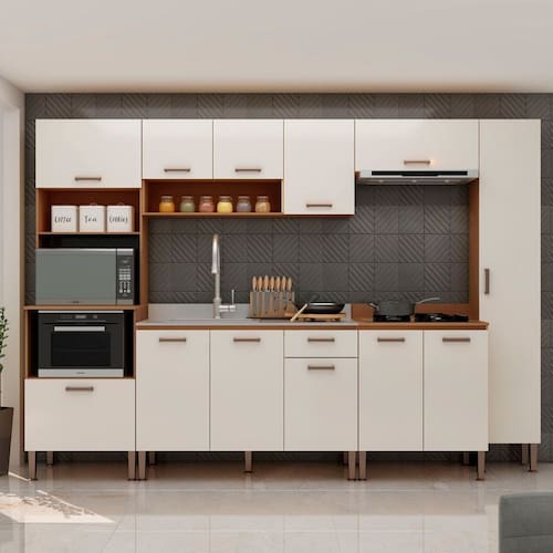 Espaço Otimizado: Módulos projetados para maximizar o armazenamento e facilitar o acesso aos seus utensílios e eletrodomésticos.