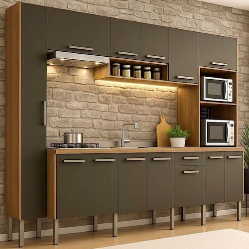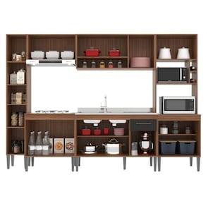 Os nichos superiores abertos são ideais para temperos ou decoração, enquanto a torre quente acomoda forno e micro-ondas com total segurança, além de um suporte para garrafas.