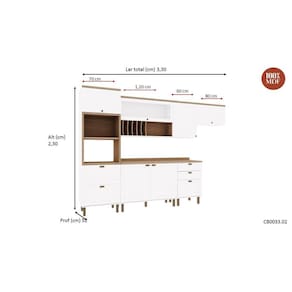 Possui um aéreo de 1200 com porta pratos e vidros no estilo mini boreal. Acabamento da Prateleira: Pintura Texturizada UV Escala de Brilho da Prateleira: Fosco Acabamento da Gaveta: Pintura Texturizada UV Escala de Brilho da Gaveta: Fosco Material do Puxador da Gaveta: ABS Acabamento da Porta: Pintura Texturizada UV Escala de Brilho da Porta: Fosco Material do Puxador da Porta: ABS Acabamento: Pintura UV Acabamento dos Pés: Pintura Acompanha Tampo: Sim Altura dos Pés: 17 Ambiente Principal: Cozinha Complexidade da Montagem: Média: pode ser montado por mais de uma pessoa e/ou necessite de maior conhecimento para montagem Cor: Branco/Ébano Cor do Produto: Branco/Ébano Cor Flex: Não Cor Interna: Branco Escala de Brilho: Fosco Gaveta com Chave: Não Informações Complementares: Itens Inclusos: Cozinha Completa 6 Peças Torre Quente 2 Balcões 3 Armários Aéreos, Kit Ferragens e Manual para Montagem Linha ou Coleção: Iluminata Manual de Especificação Técnica: Manual de Montagem e Instalação: https://cdn2.madeiramadeira.com.br/atributo/genialflex-moveis/981387-cb0033.pdf Material da Gaveta: MDF Material da Pia: Material da Porta: MDF Material da Prateleira: MDF Material do Fundo: 3MM Material do Tampo: MDF Material dos Pés: ABS Medida de cada item (A x L x P): Kit 2 Fornos (2,30x70x52) Aereo de 1,20 (78x1,20x29,8) Balcão de 1200 (91x1,20x52) Aereo de 60CM (78x60x31,5) Balcão de 60 cm (91x60x52)Aereo de 80 cm ( 78x80x31,5) Medida do Recorte para Cooktop: Montagem Flex: não Necessita Montagem: Sim O Balcão Acompanha Pia: Não Origem do Produto: Nacional Pés Reguláveis: Sim Peso: 186.6 Peso Máximo por Gaveta: 7 Peso Máximo por Prateleira: 7 Possui Pés: 13 Possui Portas: 08 Possui Prateleiras: 02 Possui recorte para Cooktop: Não Possui Rodízio: Não Recomendações de Uso, Manutenção e Limpeza: Limpar com pano umedecido Rodízio com Trava: Sapatas Niveladoras: Sim Sistema de Montagem: Minifix e Parafusos Suporta Até (kg): 55 Tamanho Indicado da Pia: 1.2l Tamanho Indicado do Tampo: Tipo de Corrediça da Gaveta: Metálica Telescópica Tipo de Dobradiça da Porta: Alumínio Tipo de Madeira Maciça: Tipo de Madeira Maciça da Gaveta: Tipo de Madeira Maciça da Porta: Tipo de Madeira Maciça da Prateleira: Tipo de Madeira Maciça do Puxador da Gaveta: Tipo de Madeira Maciça do Puxador da Porta: Tipo de Madeira Maciça dos Pés: Tipo de Porta: Misto (Bater e Basculante) Tipo de Puxador da Gaveta: Externo Tipo de Puxador da Porta: Externo