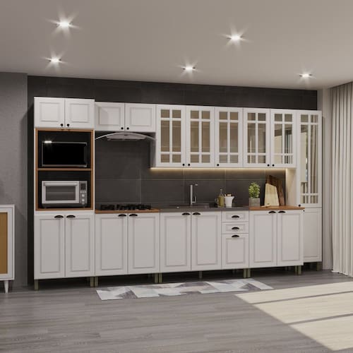 A Cozinha Completa Paris 8 Peças é ideal para quem busca praticidade com um toque moderno. Com acabamento branco e portas com vidro, traz leveza e sofisticação ao ambiente. Conta com armários aéreos, balcão, paneleiro e espaço funcional para organização. Não acompanha tampo, permitindo personalização conforme seu estilo. Acabamento da Prateleira: Pintura Escala de Brilho da Prateleira: Brilhante Acabamento da Gaveta: Pintura Texturizada UV Escala de Brilho da Gaveta: Brilhante Material do Puxador da Gaveta: Metal Acabamento da Porta: Pintura Texturizada UV Escala de Brilho da Porta: Brilhante Acompanha Tampo: Sim Ambiente Principal: Cozinha Balcão Suporta Pia: Sim codigo_ean: 7900288206589 Complexidade da Montagem: Alta: deve ser montado por um montador especializado Cor: Branco Cor do Produto: Branco Cor Interna: Branco Escala de Brilho: Brilhante Espessura do Tampo: 22 mm Gaveta com Chave: Não Itens Inclusos: 1 Cozinha Completa, Kit Ferragens e Manual de Montagem Linha ou Coleção: Paris Manual de Montagem e Instalação: https://product-hub-prd.madeiramadeira.com.br/194792657/documents/d895f2ee-dba0-4276-a117-d089854b3182302055374617509588352534.pdf Marca: Indekes Material da Corrediça: Metálica Material da Dobradiça/Corrediça da Porta: Metálica Material da Gaveta: MDF/MDP Material da Porta: MDF Material da Prateleira: MDP Material do Tampo: MDF Medida de cada item (A x L x P): Kit forno: 226x70x53 armário de 120: 81x120x32 balcão de 120: 93x120x53 armário geladeira: 36x80x32 balcão para cooktop: 93x80x53 balcão de 80: 93x80x53 paneleiro: 226x40x32 armário de 80: 81x80x32 Medida do Recorte para Cooktop: 520/620x360 - Desenho na caixa modular: Sim Necessita Montagem: Sim O Balcão Acompanha Pia: Não Origem do Produto: Nacional Peso: 237 kg Peso Máximo por Gaveta: 3 kg Peso Máximo por Prateleira: 5 kg Possui Pés: 21 Possui Portas: Sim Possui Prateleiras: Sim Possui recorte para Cooktop: Sim Possui Vidro: Sim Produto Montado: Sim Recomendações de Uso, Manutenção e Limpeza: Não limpar com álcool ou qualquer outro produto quimico. Utilize somente pano seco ou levemente umedecido. Sistema de Montagem: Cavilhas de madeira e parafusos tipo "fixer" especialmente desenvolvido para madeira. Tamanho Indicado da Pia: 53x123 Tipo de Corrediça da Gaveta: Metálica Telescópica Tipo de Dobradiça da Porta: Soft close Tipo de Dobradiça/Corrediça da Porta: Soft Close Tipo de Puxador da Gaveta: Externo Tipo de Puxador da Porta: Externo