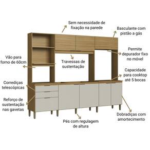 MDP, MDFCom capacidade para forno, micro, cooktop, depurador e pia, a CO2823 é a Cozinha Completa para você, que busca tudo isso em apenas 2,67m de largura e 2,10m de altura. Corrediças telescópica, dobradiças com amortecimento e pistão a gás dão a qualidade que você merece dar ao seu ambiente de cozinha. As gavetas possuem reforço de sustentação e o aéreo conta com travessas duplas de sustentação, dando mais segurança no uso do dia a dia. A CO2823 é uma cozinha completa que vai transformar o seu espaço.