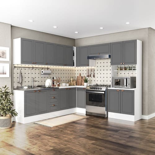 A Cozinha Pérola Completa é a união perfeita entre elegância e funcionalidade, composta por 9 módulos com design americano contemporâneo que transformam qualquer ambiente. Com 219,4 cm de altura, largura total de 502 cm (252 250 cm) e balcões com 52 cm de profundidade, ela oferece amplo espaço e organização. As portas e gavetas em MDF usinado em baixo relevo trazem sofisticação, enquanto os puxadores em cobre — modelo concha nos módulos inferiores e pontual nos aéreos — adicionam um toque de charme. Equipada com dobradiças Slide On com sistema de amortecimento (anti-impacto) e pistão na porta basculante para abertura suave, essa cozinha alia beleza e conforto no uso diário. Acompanha rodapé de acabamento e inclui torre quente, aéreo 3 portas, balcão 2 portas com 3 gavetas, basculante, ba