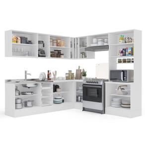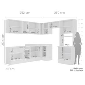 Medida de cada item (A x L x P): Balcão (84cm x 120cm x 50,5cm); Aéreo 3 Portas (67cm x 120cm c 36,5 cm); Basculante ( 33,5cm x 80cm x 36,5cm); Aéreo Canto (67cm x 90+52cm x 35cm); Balcão Canto ( 94cm x 90+52cm x 52cm) ; Aéreo 2 Portas (67cm x 80cm x 36,5cm); Balcão 2 Portas (93,7cm x 80cm x 52 cm) ; Torre quente (219,4 cm x 80cm x 52cm)