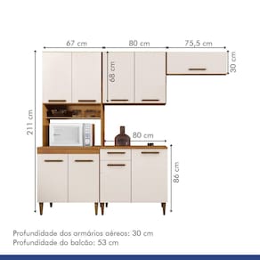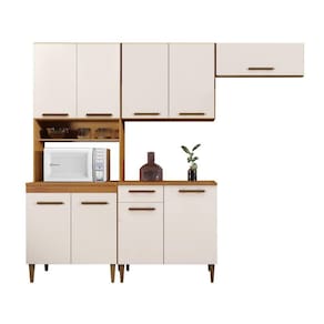 Na hora de mobiliar o seu cômodo de chef você não precisa comprometer a decoração para ter um móvel funcional e que acomode todos aqueles itens essenciais. A Cozinha Atenas não só está preparada para deixar o cômodo com um visual incrível, mas também vai ser a aliada perfeita para armazenar louças, utensílios, alimentos e eletrodomésticos de forma funcional. Já por fora, a peça tem acabamento charmoso com puxadores discretos que ajuda a trazer um toque especial ao ambiente, enquanto as cores versáteis agregam muito à estética dessa peça primorosa. Muito bom gosto para o seu lar-style!Cozinha Completa 9 Portas Atenas Escala de Brilho: Semi-Brilho Cor Interna: Branco Cor do Produto: Nature/Off White Cor Predominante: Marrom Garantia: 06 meses Origem do Produto: Nacional Ambiente Principal: Cozinha Altura: 211cm Largura: 222,5cm Profundidade: 53cm Peso: 96,4cm Acabamento: Pintura UV Material Principal: MDP Possui Portas: 09 Material da Porta: MDP Acabamento da Porta: Pintura Escala de Brilho da Porta: Semi-Brilho Tipo de Porta: Misto (Bater e Basculante) Tipo de Puxador da porta: Externo Material do Puxador da Porta: MDF Tipo de Dobradiça da Porta: Aço Possui Prateleiras: 04 Material da Prateleira: MDP Acabamento da Prateleira: Pintura Texturizada UV Escala de Brilho da Prateleira: Semi-Brilho Peso Máximo por Prateleira: 10 Possui Gavetas: Não Possui Pés: 08 Altura dos Pés: 17cm Material dos Pés: Plástico Acabamento dos Pés: Pintura Possui Rodízio: Não Pés Reguláveis: Sim Acompanha Tampo: Sim Material do Tampo: MDP O Balcão Acompanha Pia: Não Estilo: Moderno Necessita Montagem: Sim Complexidade da Montagem: Baixa: pode ser montado por uma pessoa sozinha Recomendações de Uso, Manutenção e Limpeza: Recomendamos que a limpeza seja feita apenas com pano umedecido. Sistema de Montagem: Parafusos. Sistema de Montagem: Parafusos. Itens Inclusos: 1 Cozinha e manual de montagem. Quantidade de Peças: 04 Medida de cada item (A x L x P): Torre Quente - 211cm x 67c m x 53cm Balcão - 86cm x 83,5cm x 53cmAereo 2 Portas - 68cm x 80cm x 30cmNicho Geladeira = 30cm x 75,5cm x 28,5cm