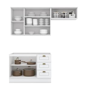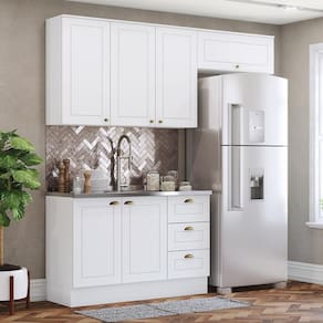 ESPECIFICAÇÕES: Estrutura 100% MDF Pintura UV 6 Portas, sendo 1 basculante 3 Gavetas Dobradiças de 35mm com amortecimento Corrediças telescópicas Puxadores em zamac ouro velho Tampos em MDP/BP Opção de instalação sem rodapés, suspensa Balcão Pia não acompanha cuba e tampo