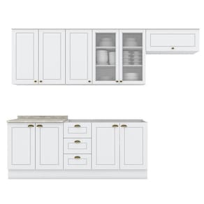 Cozinha Completa Americana 5 Peças Branco Com Vidro - Móveis Henn Branco Cozinha Completa Americana 5 Peças com Vidro - Móveis Henn Com design contemporâneo, a Cozinha Americana embeleza qualquer ambiente. Seu conceito é inspirado nas clássicas cozinhas estilo americano, oferecendo uma decoração moderna e minimalista. Ela conta com puxadores em metal zamac, dobradiças 35mm com amortecimento e espaçosos aéreos com 83cm de altura, proporcionando praticidade e funcionalidade. É um armário de cozinha 100% MDF com mais de 15 módulos, que possibilitam criar o projeto de cozinha dos seus sonhos. ESPECIFICAÇÕES: - Estrutura 100% MDF - Pintura UV - 10 Portas, sendo 2 de vidro - 3 Gavetas - Dobradiças de 35mm com amortecimento - Corrediças telescópicas - Puxadores em zamac ouro velho - Tampos em MDP/BP - Opção de instalação sem rodapés, suspensa - Balcão Pia não acompanha cuba e tampo