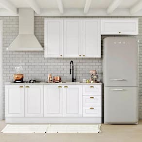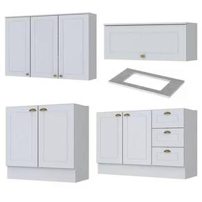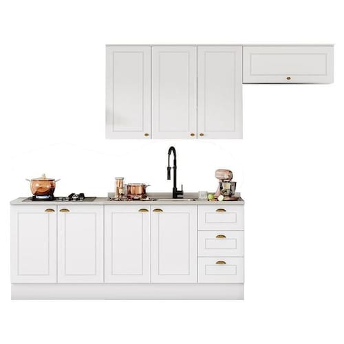 Cozinha Completa Americana 5 Peças Sem Vidro Branco - Móveis Henn Branco Cozinha Completa Americana 5 Peças sem Vidro - Móveis Henn Um conceito inspirado nas clássicas cozinhas estilo americano, seu design contemporâneo e diferenciado embeleza qualquer ambiente. Projetada para proporcionar praticidade e funcionalidade no uso. Cada acessório e detalhes escolhidos foram pensados para garantir praticidade e funcionalidade no dia a dia. ESPECIFICAÇÕES: - 100% MDF - Dobradiças de 35mm com amortecimento - Corrediças Telescópicas - Puxadores em Zamac ouro velho - Tampos em BP - Opção de instalação sem rodapés, suspensa - Gavetões com laterais altas - Caixa Branco, Frente Branco e tampos Calcare - Não acompanha cuba