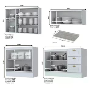 O ambiente é composto por (L x A x P): 1x C353-05 Armário Pia 3 Gavetas e 2 Portas: 120 x 82 x 51 cm 1x C354-05 Aéreo com Porta basculante: 80 x 34 x 32,5 cm 1x C355-05 Armário 2 Portas: 80 x 82 x 51 cm 1x C352-05 Aéreo 3 Portas: 120 x 83 x 32,5 cm 1x C908-114 Tampo para Cooktop: 80 x 2,5 x 53,5 cm *1x C353-05 Balcão Pia 3 Gavetas e 2 Portas: Não acompanha Cuba e Tampo Balcão Pia