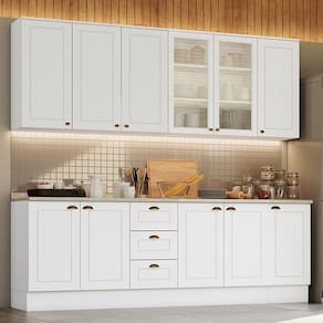 Com design contemporâneo, a Cozinha Americana embeleza qualquer ambiente. Seu conceito é inspirado nas clássicas cozinhas estilo americano, oferecendo uma decoração moderna e minimalista. Ela conta com puxadores em metal zamac, dobradiças 35mm com amortecimento e espaçosos aéreos com 83cm de altura, proporcionando praticidade e funcionalidade. É um armário de cozinha 100% MDF com mais de 15 módulos, que possibilitam criar o projeto de cozinha dos seus sonhos.
