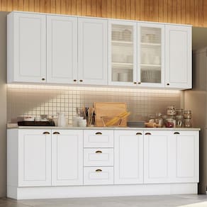 Com design contemporâneo, a Cozinha Americana embeleza qualquer ambiente. Seu conceito é inspirado nas clássicas cozinhas estilo americano, oferecendo uma decoração moderna e minimalista. Ela conta com puxadores em metal zamac, dobradiças 35mm com amortecimento e espaçosos aéreos com 83cm de altura, proporcionando praticidade e funcionalidade. É um armário de cozinha 100% MDF com mais de 15 módulos, que possibilitam criar o projeto de cozinha dos seus sonhos.