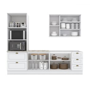 O(a) Cozinha Completa Americana 9 Portas 5 Gavetas com Vidro 100% Mdf Branco - Henn é produzido em 100% MDF na escala de brilho Fosco, e possui um grau de dificuldade de montagem: Médio.