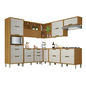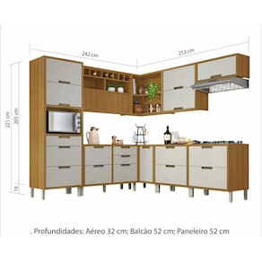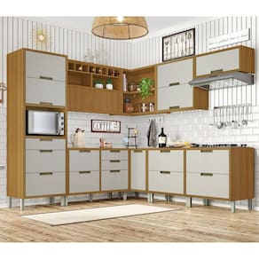 A Cozinha Completa Ângulo 9 Peças Imperatriz Nesher 100% MDF tem design contemporâneo, robusto e é muito pratica. Inspirada em cozinhas planejadas, está disponível em módulos, permitindo composições variadas, projetos exclusivos, conforme o espaço do consumidor. O armário aéreo de 120cm, foi projeto com uma porta articulada ripada, que traz aconchego, grande beleza e harmonia ao conjunto. Disponível em duas cores de porta, off-white e grafite, como o corpo sempre amadeirado freijó. Projetada para proporcionar praticidade e funcionalidade no uso diário, produzida com matérias prima de alto nível e ferragens tecnológicas de última geração. Todo o projeto foi pensado para embelezar sua cozinha com muita praticidade no uso e muita qualidade e durabilidade no dia a dia. Acabamento da Prateleira: Impressão Escala de Brilho da Prateleira: Semi-Brilho Acabamento da Gaveta: Impressão Escala de Brilho da Gaveta: Semi-Brilho Material do Puxador da Gaveta: Alumínio Acabamento da Porta: Impressão Escala de Brilho da Porta: Semi-Brilho Material do Puxador da Porta: Alumínio Acabamento dos Pés: Pintura Acompanha Tampo: Sim Altura dos Pés: 16 cm Altura Máxima dos Pés: 16.0000 Ambiente Principal: Cozinha codigo_ean: 7908506240643 Complexidade da Montagem: Média: pode ser montado por mais de uma pessoa e/ou necessite de maior conhecimento para montagem Cor: Freijó/Offwhite Cor do Produto: Freijó/Offwhite Cor Flex: Não Cor Interna: Freijó Escala de Brilho: Semi-Brilho Gaveta com Chave: Não Informações Complementares: Modernas portas com abertura basculante e pistão a gás. - Puxadores em perfil de Alumínio na cor bronze, moderno, com qualidade e durabilidade. - Corrediça Telescópica Abertura Integral: Robusta e com três estágios, esta corrediça é ideal para o uso diári Itens Inclusos: 1 Paneleiro, 4 Armários Aéreos, 4 Balcões e Manual de Montagem. Linha ou Coleção: Imperatriz - Nesher Manual de Montagem e Instalação: https://product-hub-prd.madeiramadeira.com.br/653465/documents/885c82c0-f5cc-4dcb-8ef1-0e4d924b464c4342cdf7073201cozinha9peas.zip Material da Dobradiça/Corrediça da Porta: Metálica Material da Gaveta: MDF Material da Porta: MDF Material da Prateleira: MDF Material do Fundo: Chapa de Fibra Material do Tampo: MDF Material dos Pés: Polipropileno Medida de cada item (A x L x P): Aéreo: 78cm x 80cm x 32cm; Aéreo Adega: 78cm x 120cm x 32cm; Aéreo Canto: 78cm x 93cm x 52cm; Aéreo Geladeira: 34cm x 80cm x 32cm; Balcão 1 Gaveta 1 Porta: 86cm x 80cm x 52cm; Balcão 2 Portas, 4 Gavetas: 86cm x 120cm x 52cm; Balcão canto: 86cm x 93cm x 52cm; Paneleiro: 221cm x 70cm x 52cm Medida do Recorte para Cooktop: 62cm x 35cm Montagem Flex: Não Necessita Montagem: Sim O Balcão Acompanha Pia: Não Origem do Produto: Nacional Pés Reguláveis: Sim Peso: 321,6 kg Peso Máximo por Gaveta: 5 kg Peso Máximo por Prateleira: 15 kg Possui Pés: 20 Possui Portas: Sim Possui Prateleiras: Sim Possui recorte para Cooktop: Não Possui Rodízio: Não Produto Montado: Sim Recomendações de Uso, Manutenção e Limpeza: Limpar com pano macio e levemente umedecido. Não utilizar solventes a base e de inflamáveis. Não utilizar produtos abrasivos. Sapatas Niveladoras: Sim Sistema de Montagem: Parafusos, Cavilhas e Minifix Suporta Até (kg): 150 kg Tamanho Indicado da Pia: 120 x 53cm Tipo de Corrediça da Gaveta: Metálica Telescópica Tipo de Dobradiça da Porta: Metálica Tipo de Dobradiça/Corrediça da Porta: Metálica Tipo de Puxador da Gaveta: Externo Tipo de Puxador da Porta: Externo
