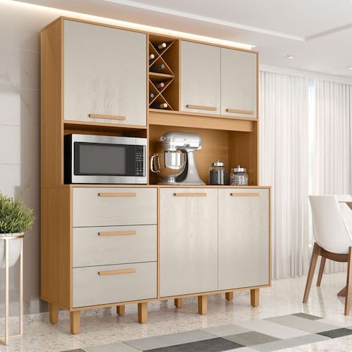 Armário 5 Portas 3 Gavetas com Nicho e Adega. Armário Max 5P 3G oferece organização, funcionalidade e excelente aproveitamento interno para o dia a dia. Seu design moderno facilita a composição do ambiente, mantendo utensílios e mantimentos sempre bem distribuídos. Conta com 5 portas com ótima divisão interna e 3 gavetas com corrediças telescópicas, que garantem abertura suave e maior durabilidade. Possui nicho para micro-ondas e adega integrada, agregando ainda mais praticidade. Os pés com regulagem de altura permitem melhor nivelamento do móvel. Uma solução completa para quem busca organização, praticidade e ótimo custo-benefício. Acabamento da Prateleira: Pintura Texturizada UV Escala de Brilho da Prateleira: Fosco Acabamento da Gaveta: Pintura Texturizada UV Escala de Brilho da Gaveta: Fosco Material do Puxador da Gaveta: MDF Acabamento da Porta: Pintura Texturizada UV Escala de Brilho da Porta: Fosco Material do Puxador da Porta: MDF Acompanha Rodapé Decorativo: Não Acompanha Tampo: Sim Ambiente Principal: Cozinha Balcão Suporta Pia: Não codigo_ean: 7900288348227 Complexidade da Montagem: Alta: deve ser montado por um montador especializado Cor: Cinamomo/Areia Cor do Produto: Cinamomo/Areia Cor Interna: Cinamomo Escala de Brilho: Fosco Espessura do Material da Estrutura: 15 mm Gaveta com Chave: Não Itens Inclusos: 1 Cozinha Completa, Manual de Montagem e Kit Ferragem Linha ou Coleção: Max Manual de Montagem e Instalação: https://product-hub-prd.madeiramadeira.com.br/158159271/documents/1cc03928-70cd-422e-9d22-00e01c5ed5bf341938857381772132512121.pdf Marca: Zanzini Material da Corrediça: Metálica Material da Dobradiça/Corrediça da Porta: Metálica Material da Gaveta: MDP Material da Porta: MDP Material da Prateleira: MDP Material do Fundo: MDF Material do Tampo: MDP Material dos Pés: Plástico modular: Não Montagem Flex: Não Necessita Montagem: Sim O Balcão Acompanha Pia: Não Origem do Produto: Nacional Pés Reguláveis: Sim Peso: 86,5 kg Peso Máximo por Gaveta: 3 kg Peso Máximo por Prateleira: 6 kg Possui Pés: 08 Possui Portas: Sim Possui Prateleiras: Sim Possui recorte para Cooktop: Não Possui Rodízio: Não Possui Vidro: Não Produto Montado: Sim Recomendações de Uso, Manutenção e Limpeza: Limpe com pano macio seco; não use produtos abrasivos, químicos ou álcool; evite impactos, arranhões, exposição direta à luz solar e umidade. Sapatas Niveladoras: Não Sistema de Montagem: Parafusos auto atarraxantes, cola, cavilhas, pregos, minifix Suporta Até (kg): 64 kg Tipo de Corrediça da Gaveta: Metálica Telescópica Tipo de Dobradiça da Porta: Simples Tipo de Puxador da Gaveta: Externo Tipo de Puxador da Porta: Externo