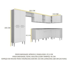 - Cozinha: Altura: 191 cm - Largura: 321 x 115 cm - Profundidade: 27,5 cm (aéreos e paneleiro) - 45 cm (balcão com tampo)