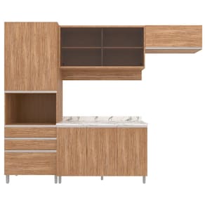 O Armário Aéreo com Portas de Vidro traz um visual sofisticado com acabamento Damasco e vidro temperado, ideal para organizar utensílios e louças com estilo. Já o Paneleiro com 2 portas e 3 gavetas oferece espaço de sobra para armazenar mantimentos e eletroportáteis, com corrediças telescópicas que garantem suavidade e durabilidade no uso.