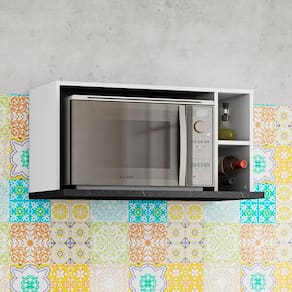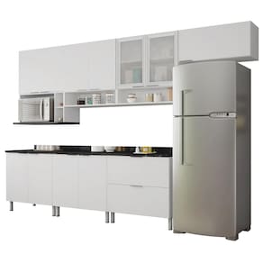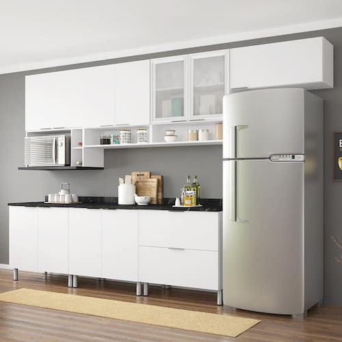 Essa configuração conta com armários aéreos, nicho para micro-ondas que otimiza o espaço, armário com portas de vidro que garantem mais estilo e armário de geladeira. Além disso, os balcões oferecem espaço de bancada para eletroportáteis como liquidificador, batedeira, sanduicheira, etc., para que tudo esteja sempre à mão quando necessário.