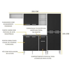 Altura: 191 cm / Largura: 231 cm / Profundidade: 27,5 cm (aéreos e paneleiro) - 45 cm (balcão com tampo) / Espaço do nicho para fogão/geladeira: Altura: 168 cm - Largura: 63 cm