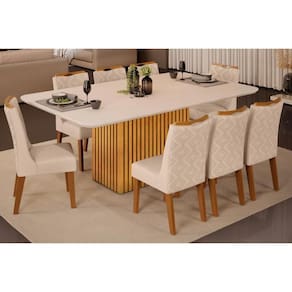 Sala de Jantar Completa Canes Tampo Madeirado c/ Vidro Curvo 170x90cm e 8 Cadeiras Stela Cedro/Off White - Ipe/Linho Neve - DJ Móveis Abaixo segue os produtos do KIT: Sala de Jantar Completa Canes Tampo Madeirado c/ Vidro Curvo 170x90cm e 8 Cadeiras Stela Cedro/Off White - Ipe/Linho Neve - DJ Móveis